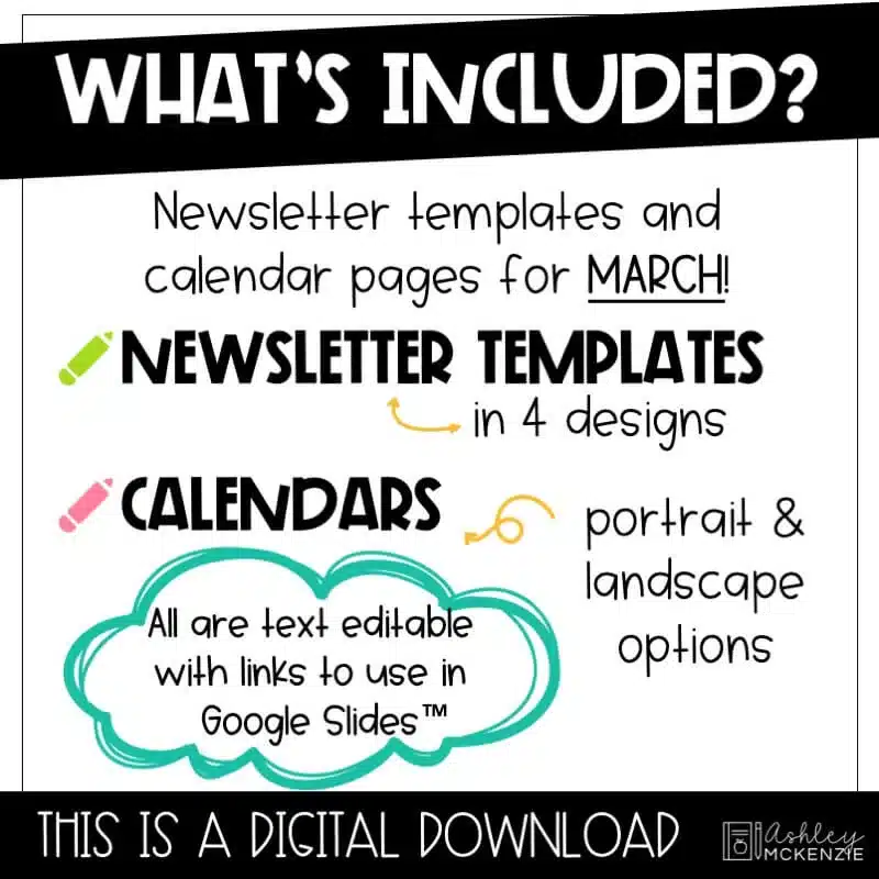 Looking for ready-to-go March newsletter templates? Here they are! Easily keep students and their families engaged and in-the-loop with spring newsletter templates and March calendars! These editable templates and matching calendars work in PowerPoint and Google Slides™. Designed with busy teachers in mind, this resource makes it quick and easy to create professional, polished classroom communication.